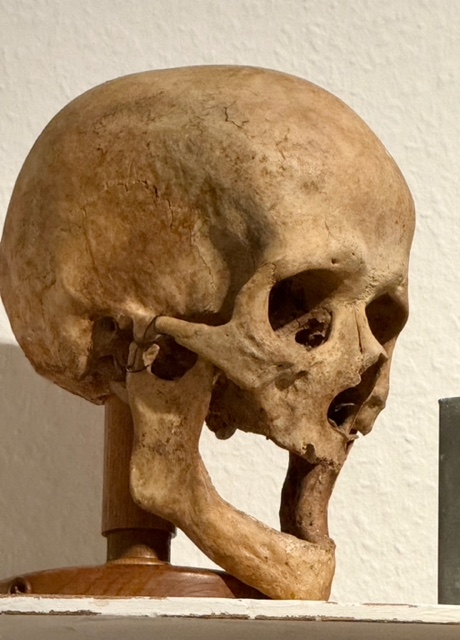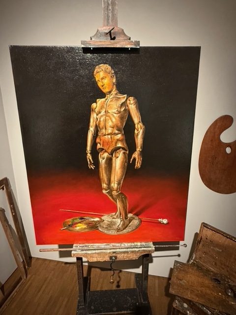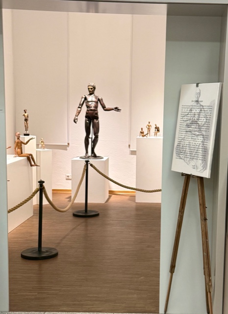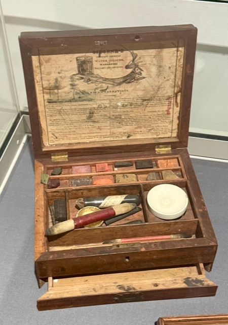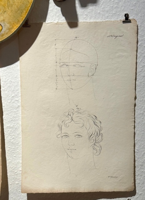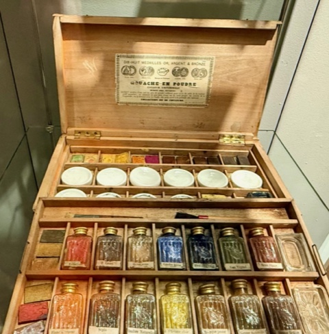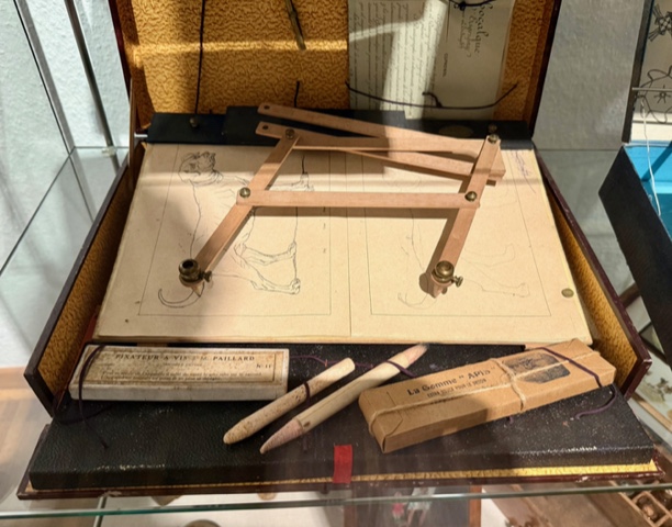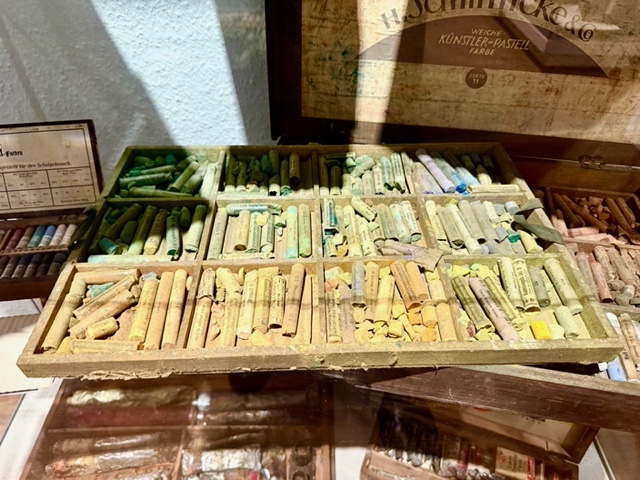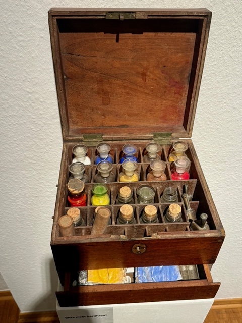 Helga war im wahrsten Sinne des Wortes in ihrem Element und erzählte uns vom lästigen Modellsitzen über verschiedene Farbherstellungsverfahren mit ihren exotischen Zutaten bis zum “Storchenschnabel”, einem Pantographen, der zum Übertragen einer kleinen Skizze in ein größeres Format diente. Mit großem Interesse entdeckten wir wirkliche Schätze in Form von teils handgearbeiteten alten Holzmodellfiguren, wertvolle Pigmente wie das blaue Lapislazuli, eine historische Pigmentmühle, wundervolle Farbkästen mit antiken Kristallflakons und Tiegeln, Paletten und alten Staffeleien. Wir konnten uns jetzt vorstellen, wie früher die Künstler ihre Farben selbst anrührten bevor es später fertige Farben in Tuben und Näpfen zu kaufen gab, je nachdem was der Künstler bevorzugte.