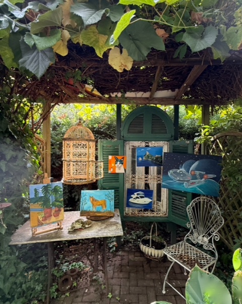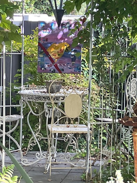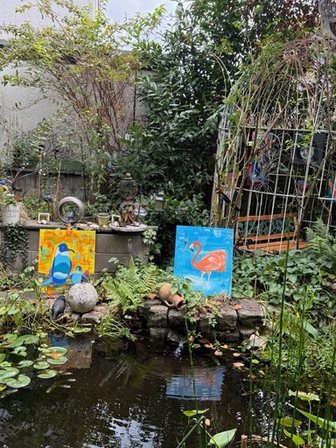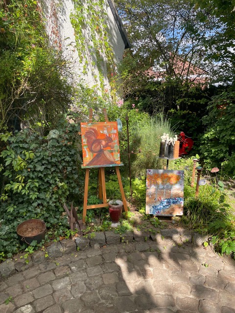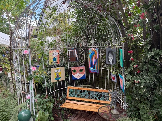Im Atelier und Garten der Langenfelder Künstlerin Helga Pollok stellten 7 Mitglieder ihre im Laufe des Jahres entstandenen Werke dem Publikum vor. Der Besucherandrang war so groß, dass teilweise die Bilder völlig verdeckt wurden.